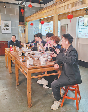 “各位老師,這是咱店的招牌牛肉面,湯底用牛骨、牛肉慢火熬了8個小時!”“馬家大爺”董事長王軍熱情地迎上前,一邊為嘉賓介紹菜品,一邊指揮店員陸續上菜。很快,一道道精心烹制的懷府特色美食亮相餐桌:冒著熱氣的牛肉面湯色清亮,鮮香誘人;過漿魚酸香濃郁,魚片鮮嫩適口;小車牛肉切片薄如蟬翼,肉質緊實不柴,入口滿是肉香與醬香的碰撞;清化姜燉銀耳則是另一番風味,本地特產的清化姜辛辣適中,搭配軟糯的銀耳和綿密的山藥,燉出的湯汁清甜滋潤,暖心又暖胃;還有傳承百年的清化街灌腸,外焦里嫩,澆上蒜汁、辣椒油,一口下去酸辣鮮香,盡顯地方特色。