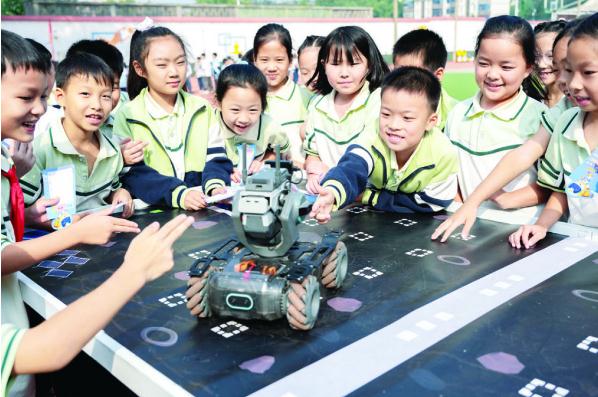 集中展演結(jié)束后,同學(xué)們以班級為單位,分別體驗了投籃機(jī)器人、推箱子機(jī)器人、水火箭、巨幅畫、3D打印、跳舞機(jī)器人等科技項目,校園成了一片歡樂的海洋。
