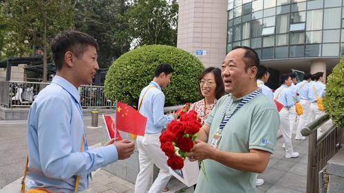 合唱團成員返校時,馮鑫(左)受到北京語言大學校領導的熱情迎接。