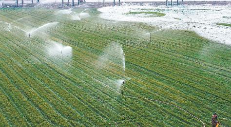 2月18日,在修武縣城關(guān)鎮(zhèn)大韓村,種植大戶范中越流轉(zhuǎn)的916畝小麥種子田正在進(jìn)行灌溉。地里,一排排立桿式噴灌隨著噴頭轉(zhuǎn)動(dòng),“呲呲”地往外噴著水,細(xì)密的水流滋潤(rùn)著土地,讓麥苗“喝飽喝足”。
