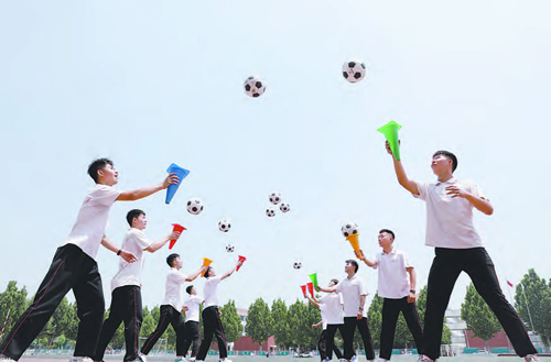 5月23日,焦作市溫縣一中高三學(xué)生在操場上做減壓游戲。