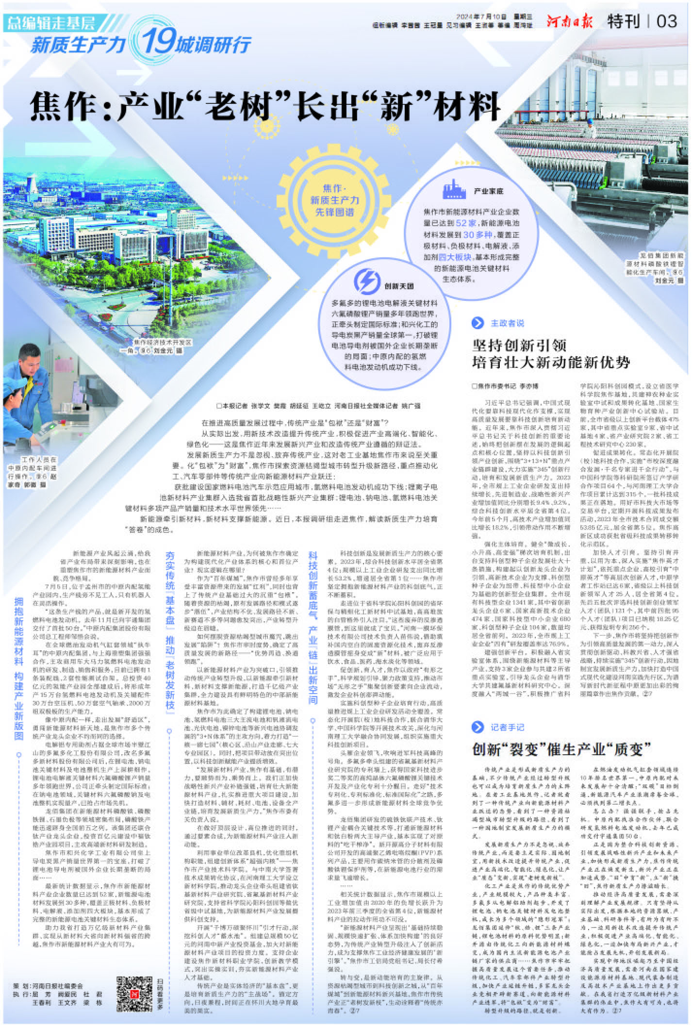 7月10日,《河南日?qǐng)?bào)》“總編輯走基層·新質(zhì)生產(chǎn)力19城調(diào)研行”以“頭版導(dǎo)讀+整版報(bào)道”的形式,推出題為《焦作:產(chǎn)業(yè)“老樹”長(zhǎng)出“新”材料》的深度報(bào)道,重點(diǎn)介紹我市化“包袱”為“財(cái)富”,探索資源枯竭型城市轉(zhuǎn)型升級(jí)新路徑,重點(diǎn)推動(dòng)化工、汽車零部件等傳統(tǒng)產(chǎn)業(yè)向新能源材料產(chǎn)業(yè)躍遷的經(jīng)驗(yàn)、做法與成效。