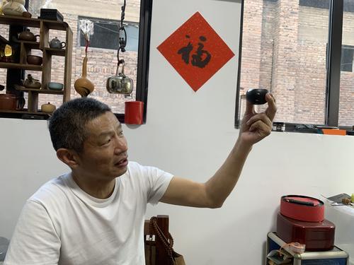 馮海全在展示修復好的黑陶茶杯。