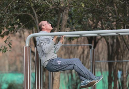 市龍?jiān)春珗@健身場地,市民進(jìn)行引體向上鍛煉。
