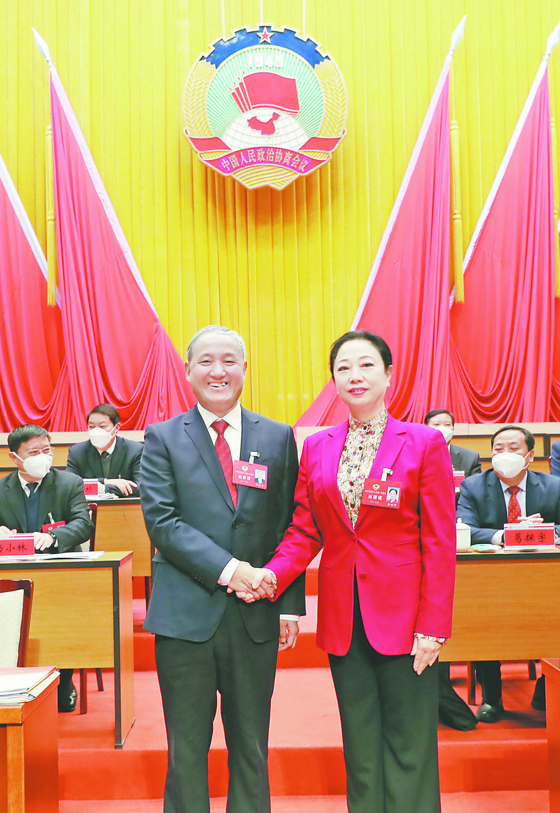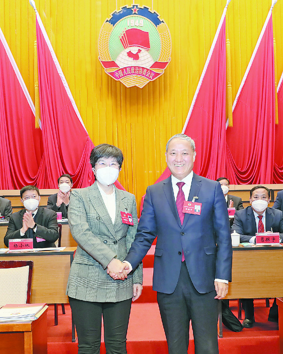 市委書(shū)記葛巧紅與新當(dāng)選的政協(xié)第十五屆焦作市委員會(huì)主席宮松奇握手表示祝賀。