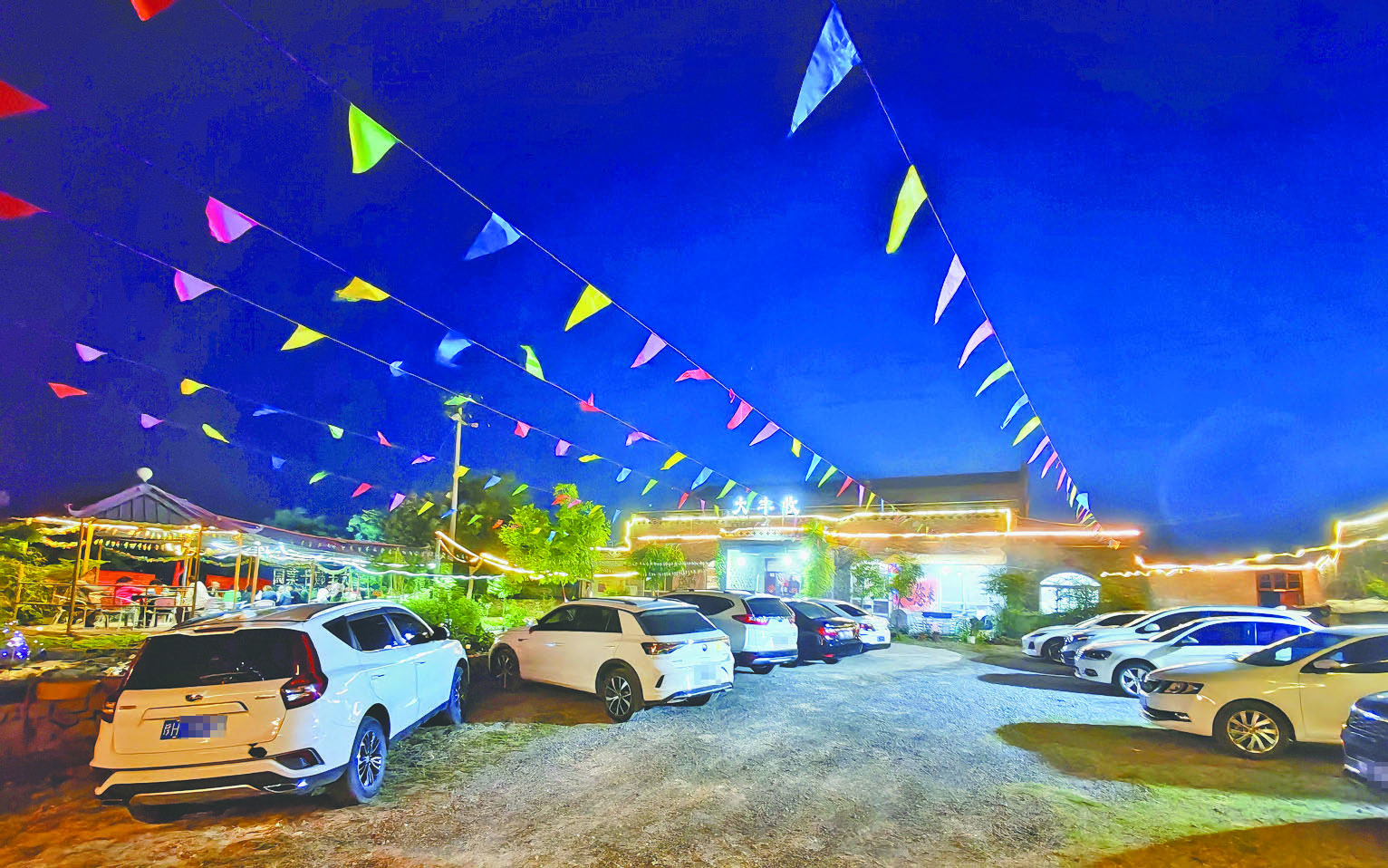 上圖 夏日夜晚燈火輝煌的民俗飯店內(nèi)仍停滿了車輛。