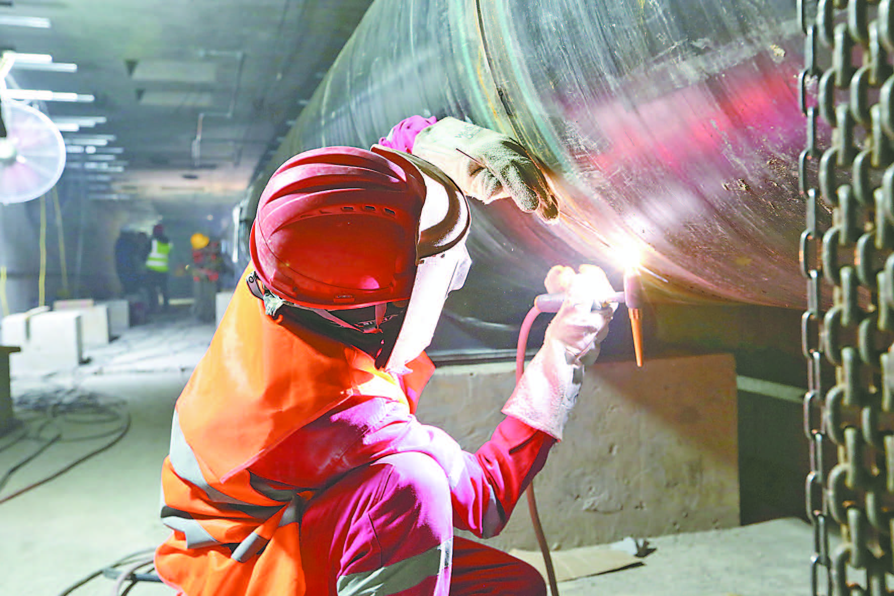在管道的接口處,經驗豐富的電焊工人要先打磨接口,確保焊接面的干凈與平整,然后進行氬弧焊,再進行氧氣焊。管道的接口經過多層多道工藝處理后,焊縫均勻且飽滿。負責物料運輸的人員在綜合管廊復雜的環境中謹慎作業。綜合管廊的下料口最多能投放6.5米長的管材,這些粗大的管材從地面投放至地下管廊后,借助小型設備運輸到指定地點,然后由施工人員將它們一節節組合在一起并進行焊接。由于管廊空間有限,且要保護管廊內已有的各類設施,增加了物料運輸的難度。