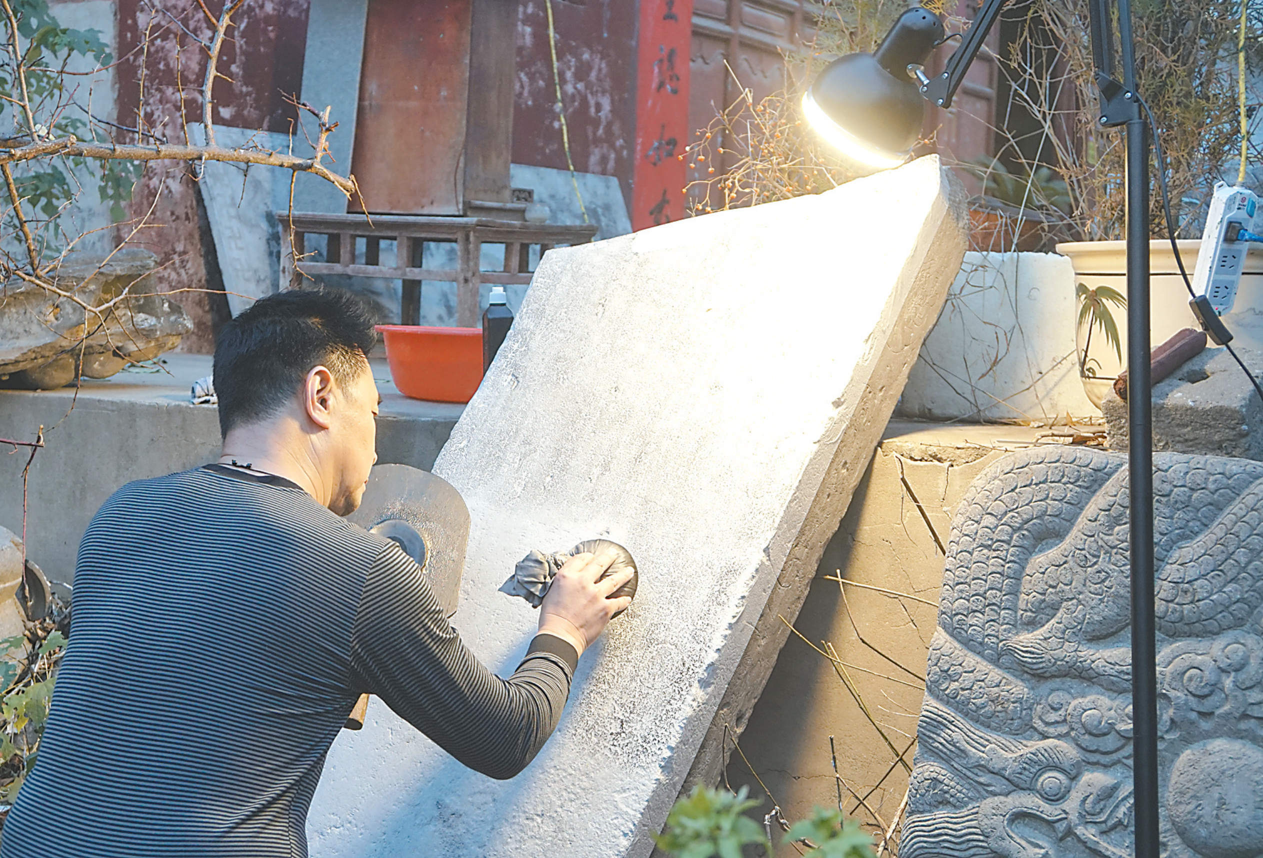 上圖 專業人員在制作古碑拓片。