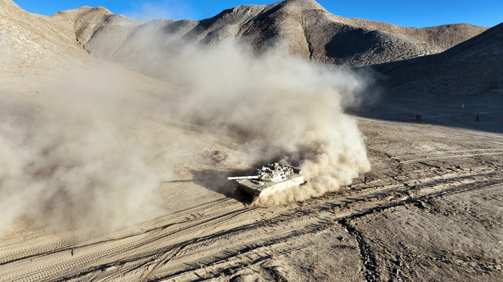 在海拔4000米的野外訓(xùn)練場(chǎng),西藏軍區(qū)某旅坦克分隊(duì)展開(kāi)復(fù)雜山地路段駕駛機(jī)動(dòng)考核(2023年1月3日攝)。新華社發(fā)(曹智 攝)