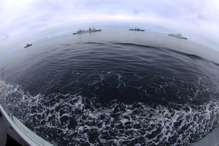 在日本海某海域進(jìn)行的“北部·聯(lián)合-2023”演習(xí)中,中俄雙方艦艇編隊(duì)航行(2023年7月20日攝)。新華社發(fā)(張海龍 攝)