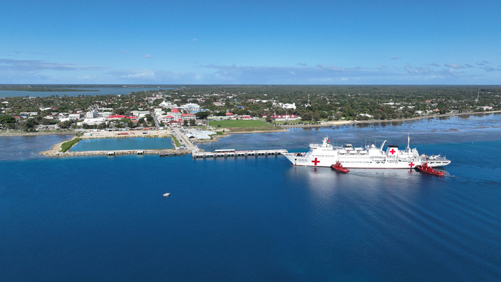 2023年7月28日,執(zhí)行“和諧使命-2023”任務(wù)的中國(guó)海軍“和平方舟”號(hào)醫(yī)院船抵達(dá)湯加王國(guó)努庫(kù)阿洛法港(無(wú)人機(jī)照片)。新華社發(fā)(桂江波 攝)