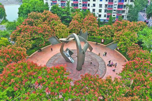 10月12日,五彩的黃山欒樹給群英河游園染上一片秋色。隨著氣溫逐漸下降,我市城區公園慢慢彰顯出斑斕的秋色,美麗的風景讓不少市民走出家門,融入秋色感受漸濃的秋意。