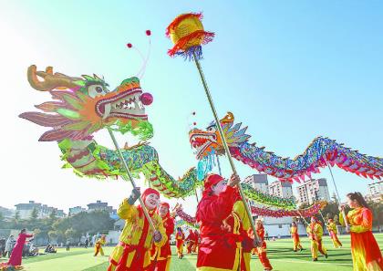 1月28日,博愛縣體育廣場,博愛空竹舞龍藝術團的成員在表演“金龍迎春”。當天,該藝術團在體育廣場上進行空竹、彩帶龍、長龍等不同藝術形式的表演,為觀眾們奉上一場視覺盛宴。