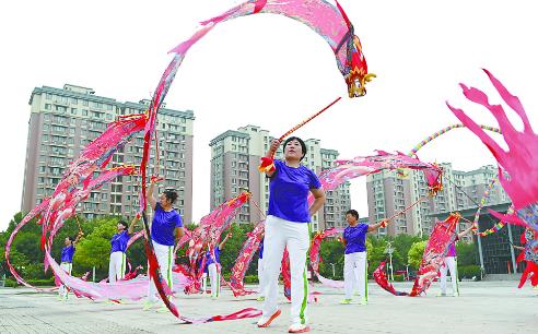 8月8日早晨,舞龍愛好者在沁陽市朱載堉音樂廣場舞動(dòng)“彩帶龍”健身。8月8日是全民健身日,在沁陽市的廣場、公園,人們采用各種方式進(jìn)行運(yùn)動(dòng)、健身。