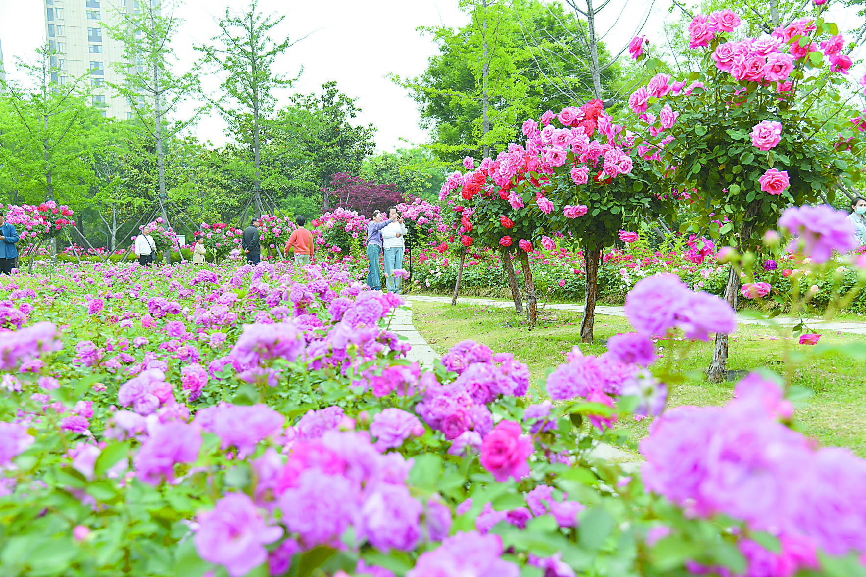 5月4日,天河公園月季園內盛開的月季花吸引許多市民前來觀賞。五一假期恰逢月季花大面積盛開的時節,觀賞效果好。我市道路兩側、口袋公園和景區內,一排排樹狀月季如同一束束艷麗的“手捧花”,各類品種、顏色的月季花海吸引大批市民和游客駐足觀賞、拍照。