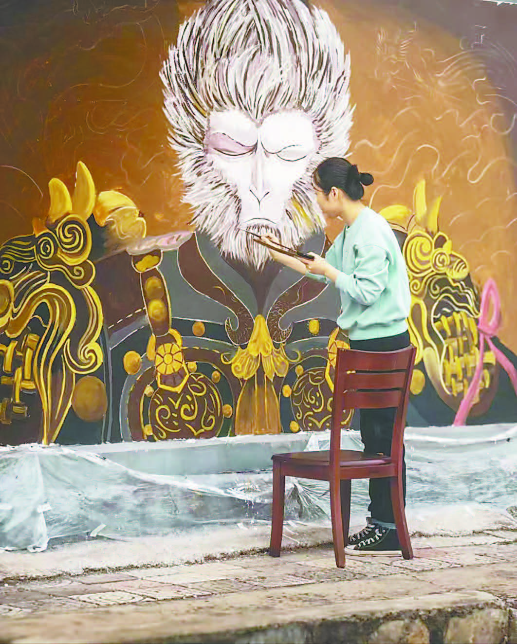 她身邊不遠處是她和姐姐王貴在不久前畫的墻繪畫,有黑神話悟空、壯麗山水,還有卡通人物等。