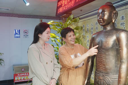 劉愛云(右)為記者講解穴位知識(shí)。