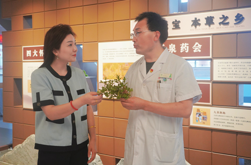 王亞軍(右)為主持人介紹馬齒莧的藥用價值。 本報記者 陳天昊 攝