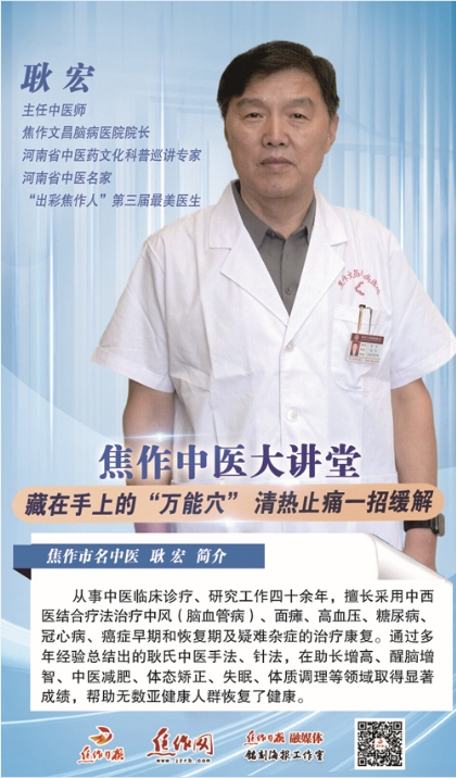 主持人:夏季炎熱干燥,很多人喜歡吃一些燒烤煎炸麻辣的東西,再用冰糕、冰鎮(zhèn)飲料來降溫,這樣不僅容易上火,還會出現(xiàn)咽喉腫痛、脾胃不適等等的情況,那么有沒有什么方法可以緩解這些癥狀呢?今天我們請焦作市名中醫(yī)、主任中醫(yī)師、焦作文昌腦病醫(yī)院院長耿宏帶大家認(rèn)識一個藏在手上的“萬能”穴位。