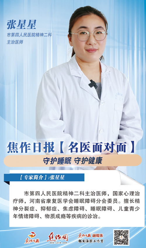 主持人:各位網友大家好,這里是焦作日報《名醫面對面》欄目。睡眠質量關乎每一個人的身心健康,但由于生活節奏的加快和學習工作壓力的增大,很多人無法保證充足的睡眠,或者睡眠質量不高,這都嚴重影響到我們的日常生活。那么如何來改善我們的睡眠呢?在3月21日全國睡眠日到來之際,我們來到市第四人民醫院,有請精神二科的張星星醫生就睡眠健康的問題與網友們進行溝通交流。