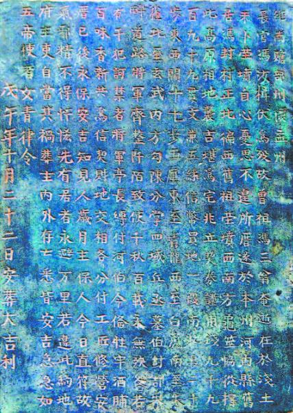 銅質(zhì)的買地券十分罕見。該買地券長32厘米、寬23厘米、厚1.5厘米,券面鐫有楷書文字16行,共290字,文字工整清晰,主要記錄了墓主人馮汝楫官場發(fā)跡后,為其父親、祖父另選安葬地址的事情。
