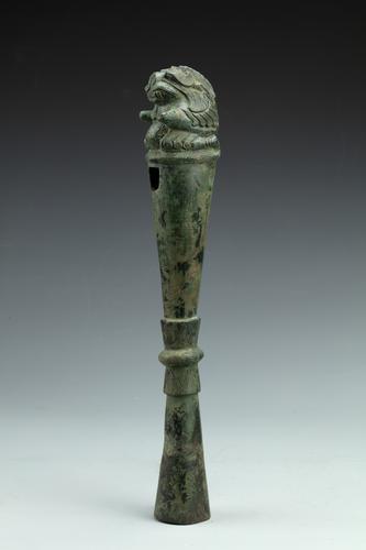 據市博物館工作人員介紹,這件西晉熨斗支架青銅質地,殘高38.7厘米、底徑4.8厘米,于1989年出土于解放區王褚街道嘉禾屯林場,修復前殘斷為兩截、底座缺失,通體表面礦化。拂去泥土和銹跡后,熨斗支架頂部現出形似小熊造型。小動物前肢伸出向前,蹲坐于支架頂端,兩眼炯炯有神,模樣憨態可掬。