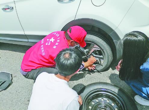 志愿者為游客換輪胎 許建 攝
