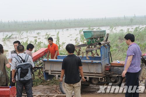 7月5日,在河南滎陽黃河灘區,當地群眾正在轉運被圍困農民的農用物資。