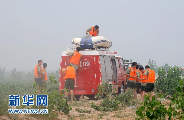 7月5日,救援人員在黃河灘區漫灘地段待命。新華社記者 趙鵬 攝