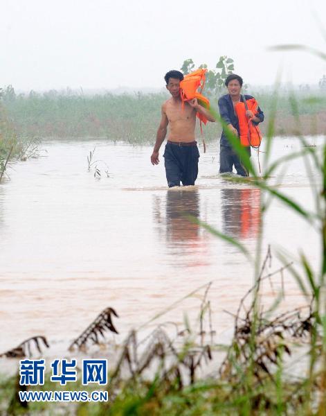 7月5日,兩名參加搜救的群眾從黃河灘區漫灘地段艱難步行。當日6時許,河南省滎陽市黃河灘區突發險情,在灘區種地的農民被突然漫灘的黃河水圍困。經當地有關部門組織搜救,目前已救出31人。搜救工作仍在進行中。新華社記者 趙鵬 攝
