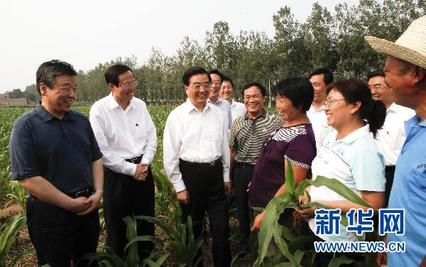 新華網河南頻道7月12日電 7月9日至11日,中共中央總書記、國家主席、中央軍委主席胡錦濤在河南省考察工作。這是胡錦濤到洛陽市孟津縣平樂鎮察看玉米長勢,向正在施肥、除草的農民了解糧食生產和銷售情況。新華社記者 李學仁 攝