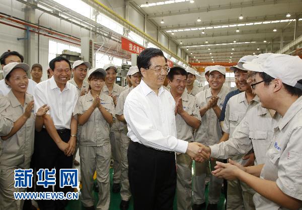 7月9日至11日,中共中央總書記、國家主席、中央軍委主席胡錦濤在河南省考察工作。這是胡錦濤同中信重工機械股份有限公司干部職工親切交談,勉勵他們不斷增強自主創新能力,全面提升企業競爭力,努力在世界裝備制造業占有一席之地。新華社記者 李學仁 攝