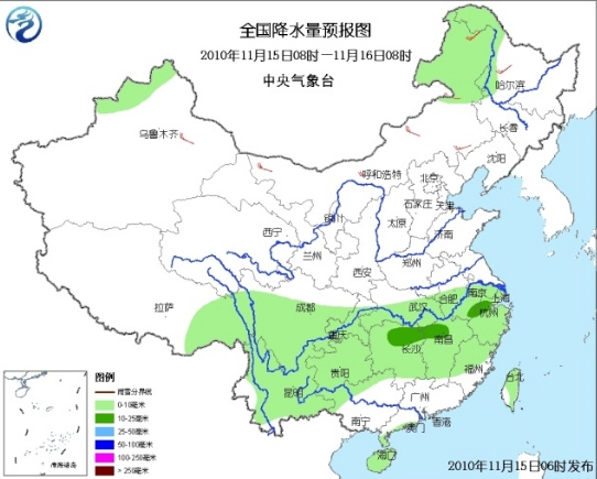 受南下冷空氣影響,15日,西南地區東部、江南大部氣溫將下降3~5℃;17日,又有一股冷空氣進入新疆,開始影響我國北方地區。未來三天,新疆北部、西藏東部、川西高原、內蒙古中東部、黑龍江西部等地有小到中雪(雨)或雨夾雪,其中,新疆北部的局部地區有大雪;江淮南部、湖北南部、江南大部、西南地區大部、海南以及臺灣等地有小到中雨。