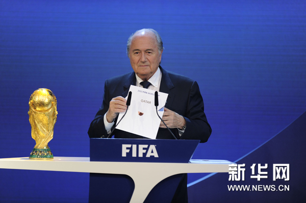 12月2日,國際足聯(lián)主席布拉特在揭曉儀式上宣布2022年世界杯舉辦地——卡塔爾。當(dāng)日,國際足聯(lián)在瑞士蘇黎世宣布,2018年和2022年世界杯足球賽分別由俄羅斯和卡塔爾舉辦。新華社/法新
