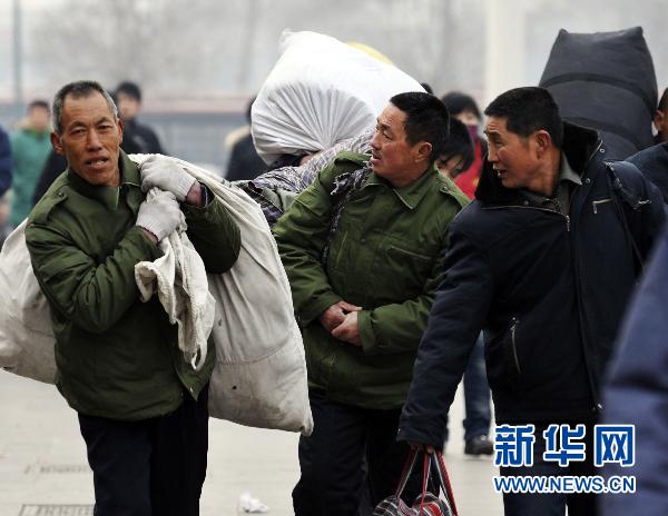 2月8日,幾名打工者背著行李來到石家莊火車站準備乘車。 新華社發(鄭榮璽 攝)