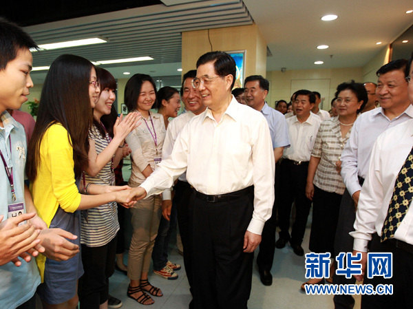 8月11日至15日,中共中央總書記、國家主席、中央軍委主席胡錦濤在廣東省考察工作。這是胡錦濤在考察深圳華強文化科技集團股份有限公司時,勉勵企業(yè)為推動社會主義文化大發(fā)展大繁榮作貢獻。新華社發(fā)