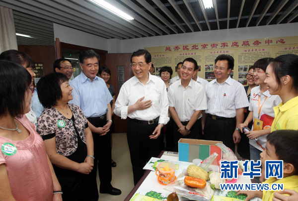 8月11日至15日,中共中央總書記、國家主席、中央軍委主席胡錦濤在廣東省考察工作。這是胡錦濤在廣州市越秀區(qū)鹽運西社區(qū)同居民和社區(qū)工作者親切交談,了解社區(qū)開展便民服務情況。新華社記者蘭紅光攝