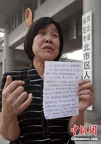 圖為王朝的母親在法院門前替兒子鳴冤。中新社發曾來增攝