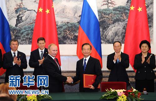 10月11日,中國(guó)國(guó)務(wù)院總理溫家寶同俄羅斯總理普京在北京人民大會(huì)堂舉行會(huì)晤后共同出席有關(guān)合作文件的簽字儀式。這是溫家寶和普京在簽字儀式上握手。新華社記者 饒愛(ài)民 攝[組圖]