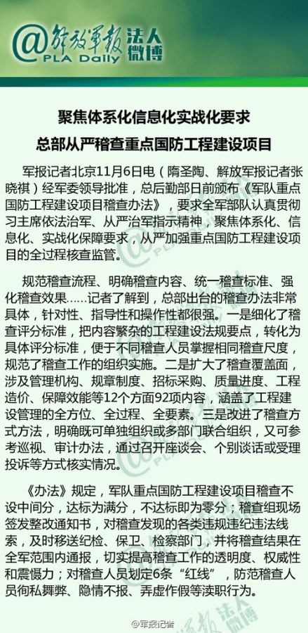中央軍委要求從嚴(yán)稽查重點國防工程建設(shè)項目