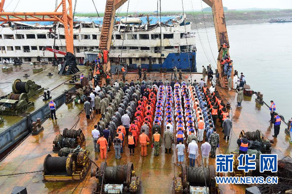 6月7日,在場人員脫帽默哀。當(dāng)日,在湖北監(jiān)利,“東方之星”號客輪翻沉事件救援現(xiàn)場舉行哀悼遇難者活動(dòng),現(xiàn)場所有人員肅立默哀3分鐘,船舶同時(shí)鳴笛3分鐘。新華社記者郝同前攝
