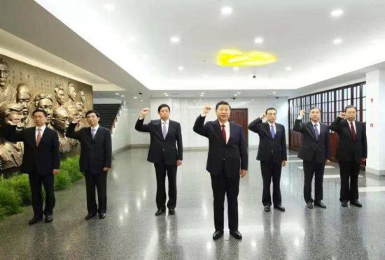 2017年10月31日,在上海中共一大會(huì)址紀(jì)念館,習(xí)近平帶領(lǐng)其他中共中央政治局常委同志一起重溫入黨誓詞。 新華社記者 蘭紅光 攝