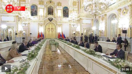 習近平強調,中國正在以中國式現代化全面推進強國建設、民族復興偉業。中方愿同俄方一道,承擔起時代賦予的特殊責任,維護全球多邊貿易體制和產業鏈供應鏈穩定暢通,為促進兩國發展振興、維護國際公平正義作出更大貢獻。