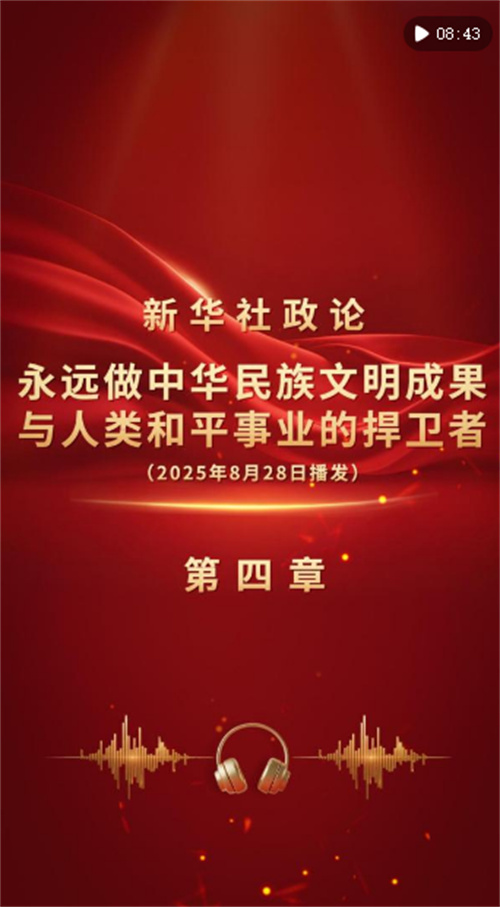 新華社8月28日播發《新華社政論|永遠做中華民族文明成果與人類和平事業的捍衛者——寫在中國人民抗日戰爭暨世界反法西斯戰爭勝利80周年之際》。我們邀請誦讀嘉賓張晚意演播“第四章”。