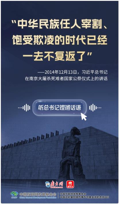 11年前的這一天,在首次南京大屠殺死難者國家公祭儀式上,習近平總書記強調:我們為南京大屠殺死難者舉行公祭儀式,是要喚起每一個善良的人們對和平的向往和堅守,而不是要延續仇恨。