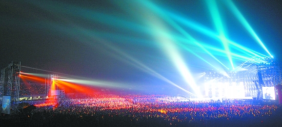 昨晚,《歡樂中國行·魅力太行》大型文藝晚會在河南理工大學南校區新體育場隆重舉行。圖為晚會現場。 本報記者 趙耀東 攝 | |