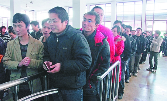 昨日9時許,記者來到焦作火車站售票大廳,看到4個售票窗口前排著的隊伍,都一直延伸到對面的墻壁,然后回折。其中絕大部分是大學生。