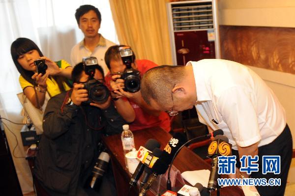 8月26日,河南航空公司監事會主席劉航在通氣會上鞠躬致歉。當日,伊春飛機失事首次新聞通氣會在黑龍江省伊春市召開。相關部門人員介紹了事故情況、救援進展和善后處理等情況,但沒有回答記者提問。新華社記者 李勇 攝