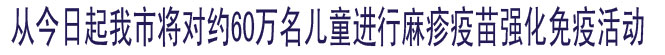 從今日起至9月20日,我市將對約60萬名1995年10月1日至2009年12月31日期間出生的兒童(含流動兒童),進(jìn)行麻疹疫苗強化免疫活動。