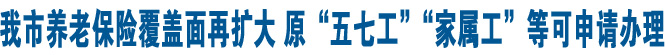 日前,省人力資源和社會保障廳下發(fā)《關(guān)于將原“五七工”“家屬工”等人員納入城鎮(zhèn)企業(yè)職工基本養(yǎng)老保險統(tǒng)籌范圍的通知》(以下簡稱《通知》),將這一部分人員納入了基本養(yǎng)老保險統(tǒng)籌范圍。從今天起,他們便可按照規(guī)定申辦養(yǎng)老保險。